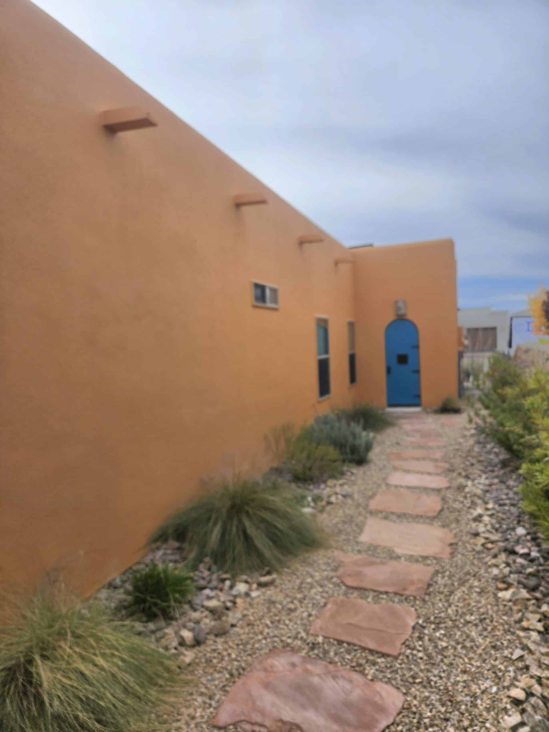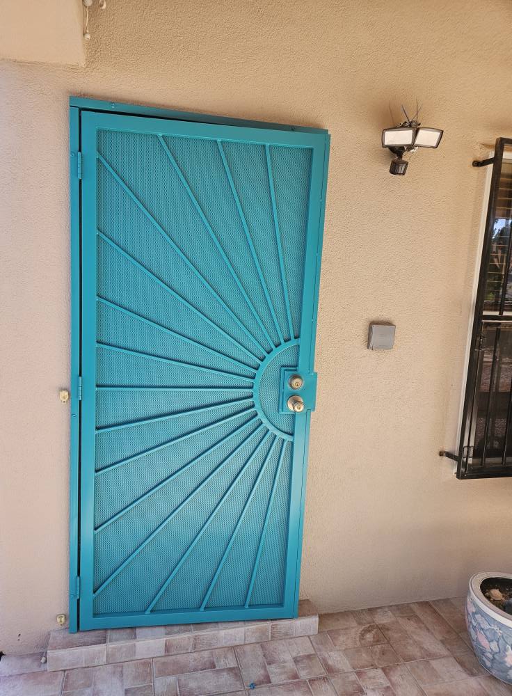 Fresh teal finish on a metal security door in Las Cruces by Engel Coatings.