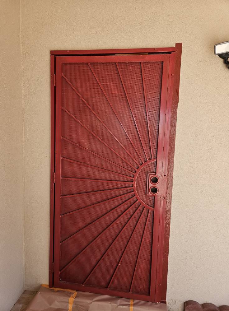Repainted metal security door with a red coat in Las Cruces by Engel Coatings.