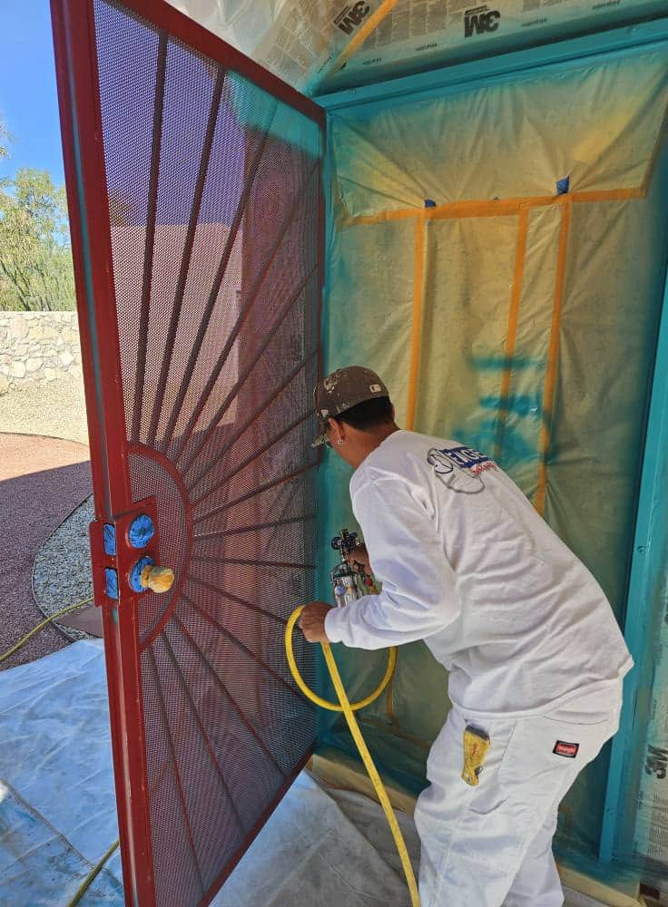 In-progress spray application and masking for a metal security door repaint in Las Cruces.